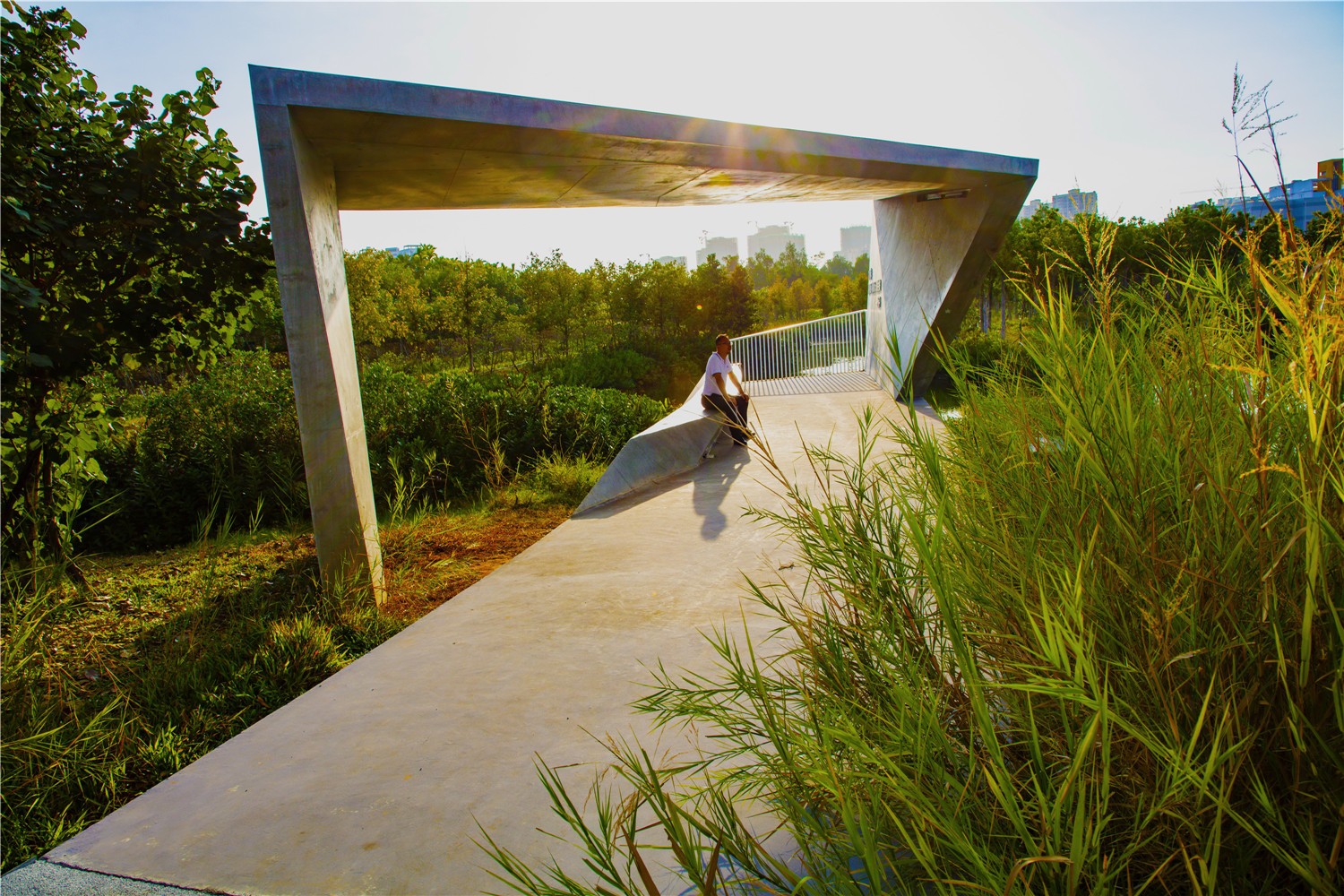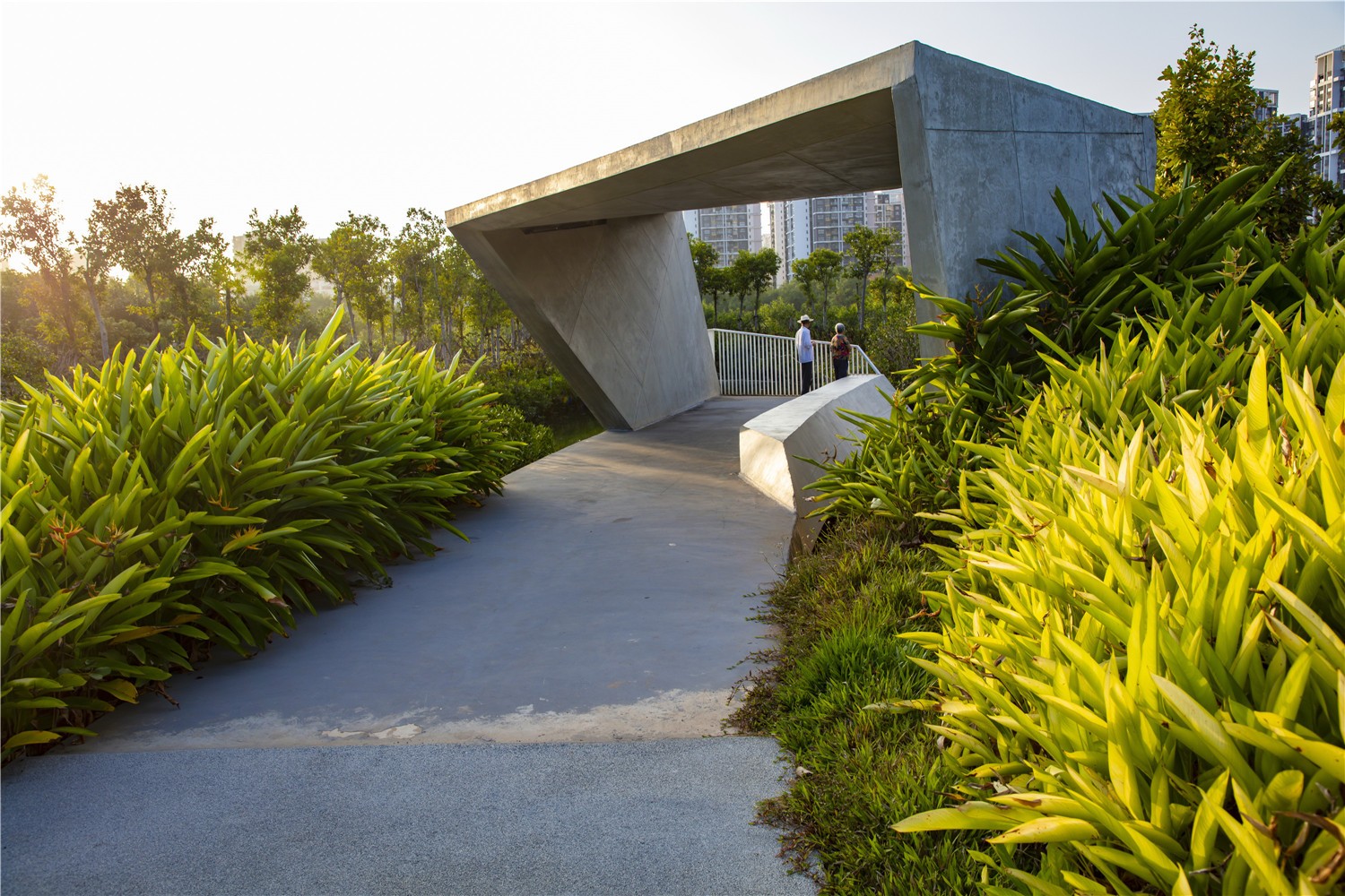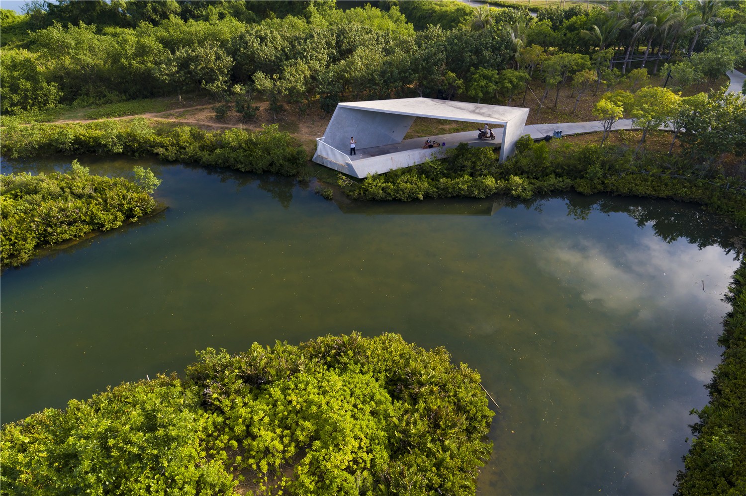 在三亞市中心,短短三年內(nèi),一片混凝土防洪墻內(nèi)的荒蕪?fù)恋乇怀晒Φ匦迯?fù)成一個郁郁蔥蔥的紅樹林公園,在這里,自然和人們和諧地共享著海潮與淡水的交融。項目遵循自然風(fēng)水的生態(tài)過程,利用指狀相扣的紅樹林混交林島來加快紅樹林修復(fù),塑造出既美麗又生態(tài)的景觀。