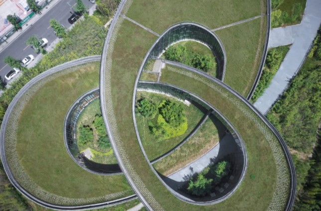 可以不必跨過邊緣就走完整個(gè)紙條。項(xiàng)目設(shè)計(jì)借鑒這一理念蘊(yùn)含“生生不息”的寓意。讓建筑在入口附近由地面抬升盤旋至最高點(diǎn),再順勢(shì)而下回歸到地面形成特殊的三瓣式莫比烏斯環(huán)。參觀者可以毫無阻礙地從室內(nèi)展覽進(jìn)入室外展覽。