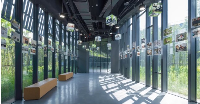 為展現(xiàn)主題,同時(shí)又回避俗套的具象化手法:建筑立面外表皮使用了豎向的金屬格柵幕墻并采用了黑白熊貓色,遠(yuǎn)觀恰似一只抄手憨坐的大熊貓,令參觀者無論身至何處都能感受到被其環(huán)抱的氛圍。