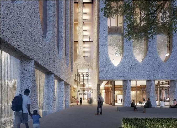 這樣的母題一直延續(xù)到了建筑底部 –在Patch獲得的渲染圖中可以看到,反拱的元素一直延伸到地面。從目前發(fā)布的圖片來看,設(shè)計(jì)團(tuán)隊(duì)采用的是布滿斑塊的混凝土表面,從遠(yuǎn)處看,立面有一種像素化的效果。